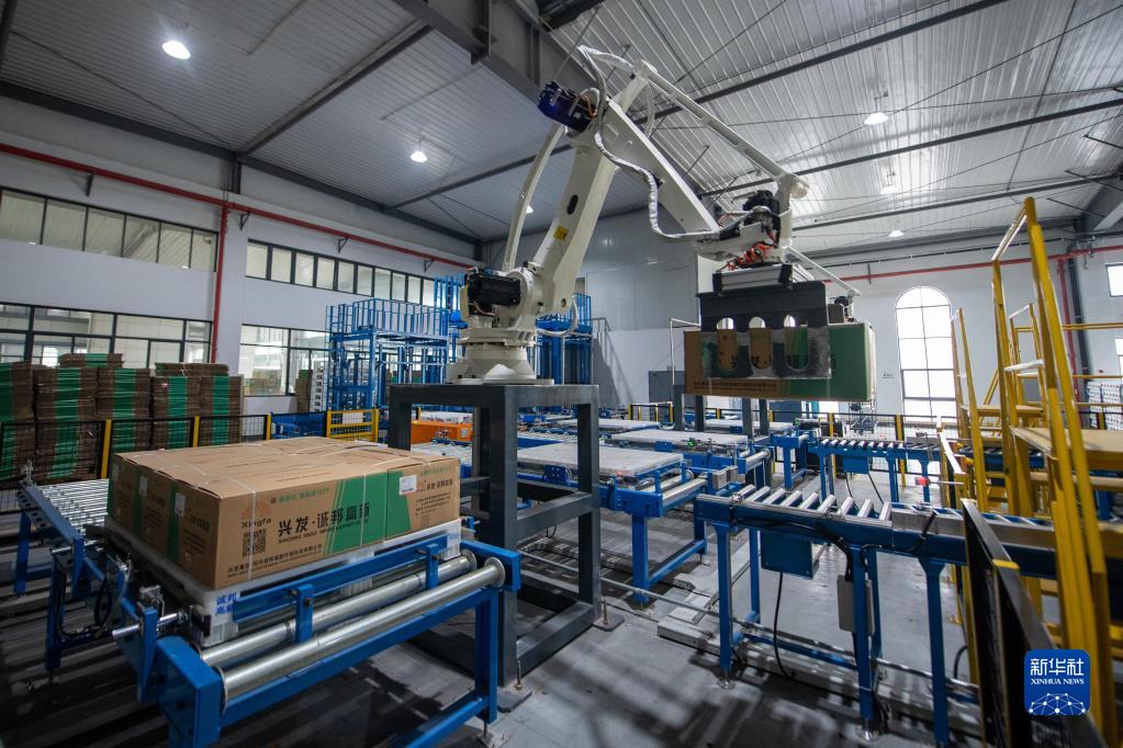 11月2日,在紹興誠邦高新纖維科技有限公司自動(dòng)化車(chē)間內,機械臂在運輸裝箱完畢的化纖材料。