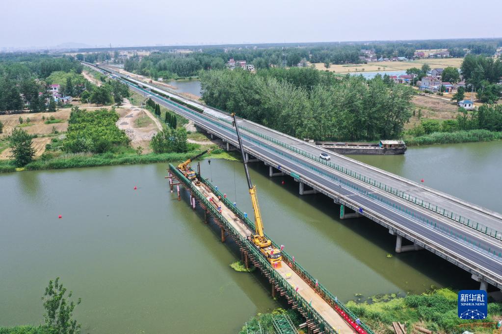工人在長(cháng)深高速公路連云港至淮安段擴建工程柴米河大橋施工現場(chǎng)搭建施工便橋(6月7日攝,無(wú)人機照片)。