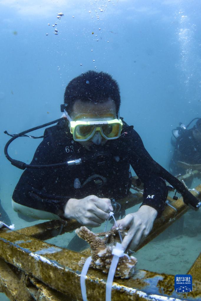 6月8日,海南省海洋與漁業(yè)科學(xué)研究院的專(zhuān)家和潛水員在海南陵水分界洲島附近海域移植珊瑚。