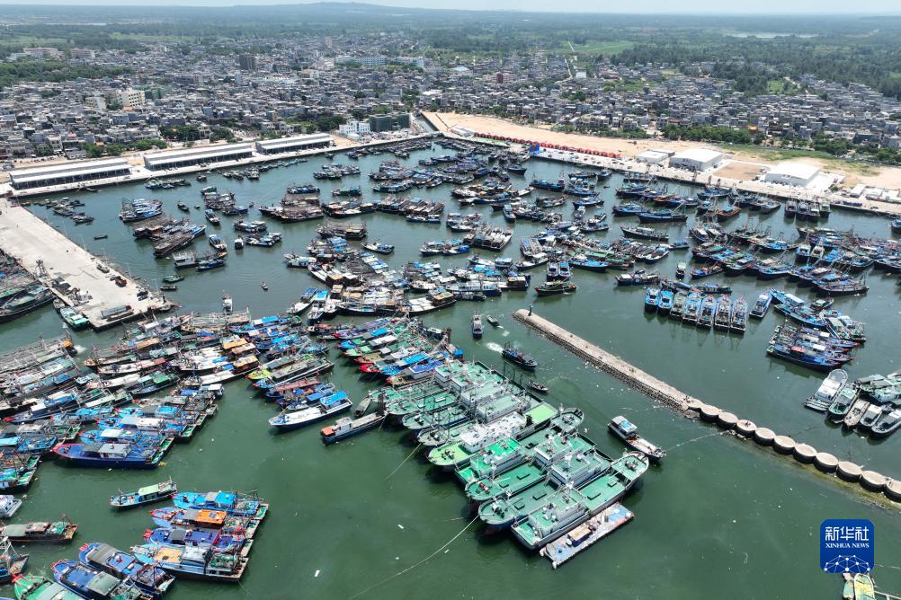 這是8月16日在海南省臨高縣新盈港拍攝的準備開(kāi)漁的漁船(無(wú)人機照片)。新華社記者 張麗蕓 攝