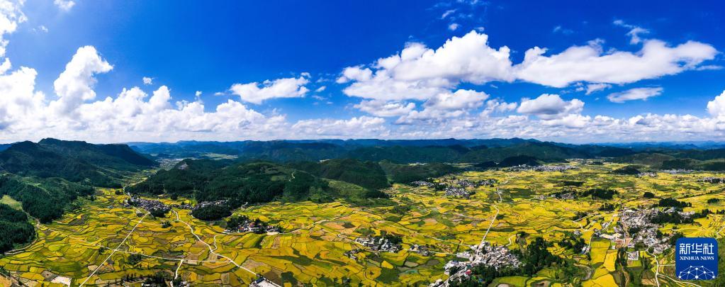 連日來(lái),貴州省黔南布依族苗族自治州龍里縣灣灘河鎮天氣晴好。水稻成熟,田野鍍金,農民搶收稻谷,一片豐收景象。