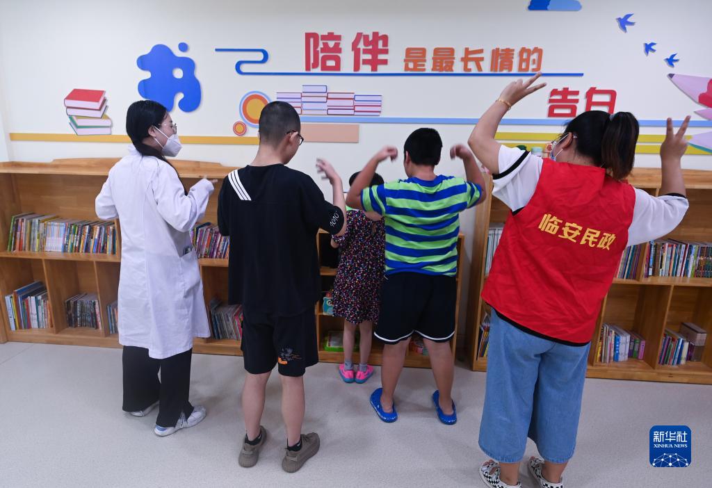 8月4日,杭州市臨安區社會(huì )福利中心的康復治療師和黨員志愿者給“添翼計劃”項目的兒童上團體課。