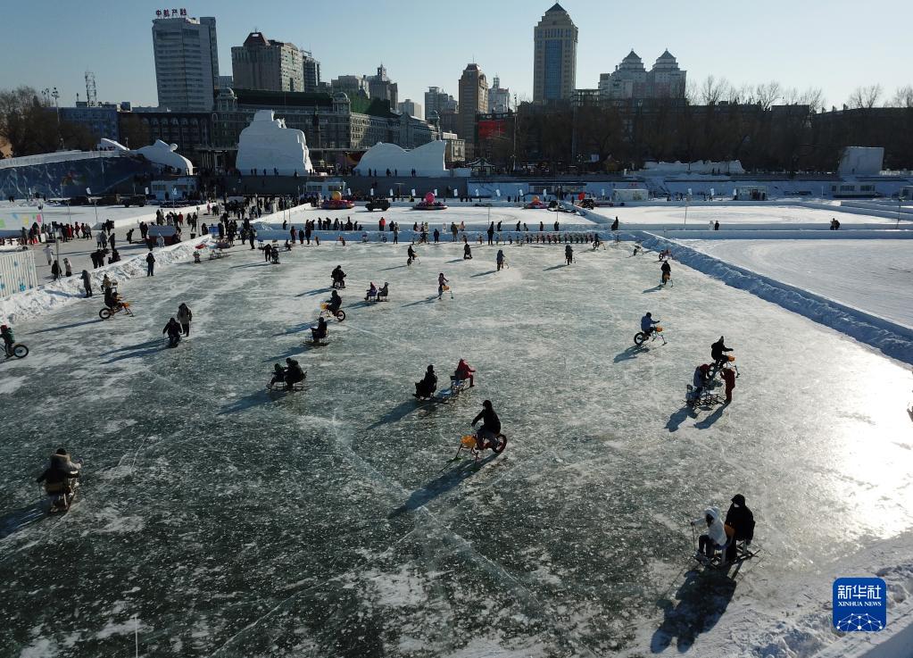 1月1日,游客在黑龍江省哈爾濱松花江冰雪嘉年華園區游玩(無(wú)人機照片)。