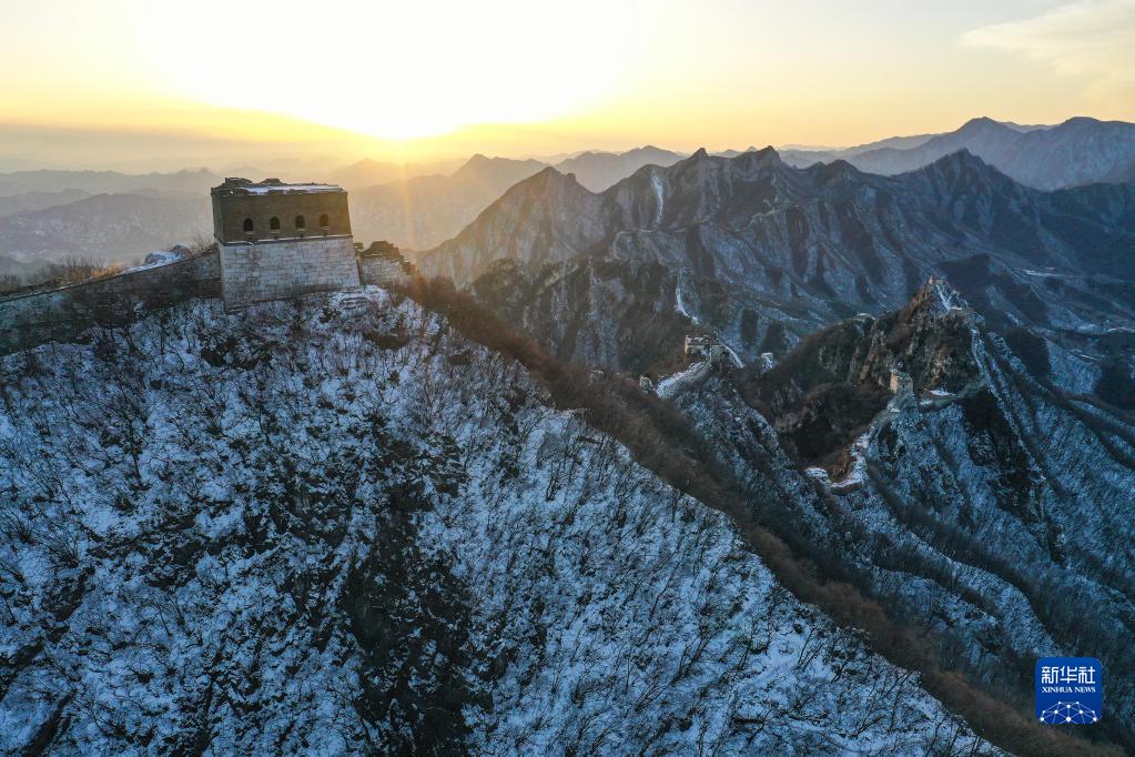 夕陽(yáng)下的箭扣長(cháng)城(2月13日攝,無(wú)人機照片)。