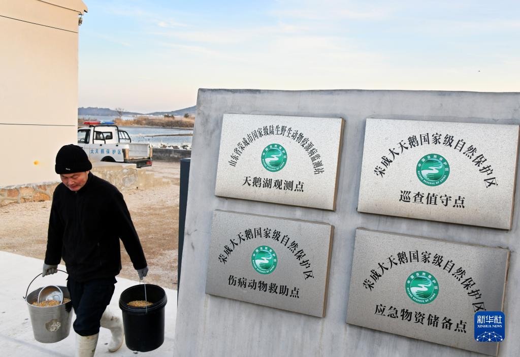 榮成市大天鵝國家級自然保護區工作人員任建平給大天鵝準備食物(2月14日攝)。