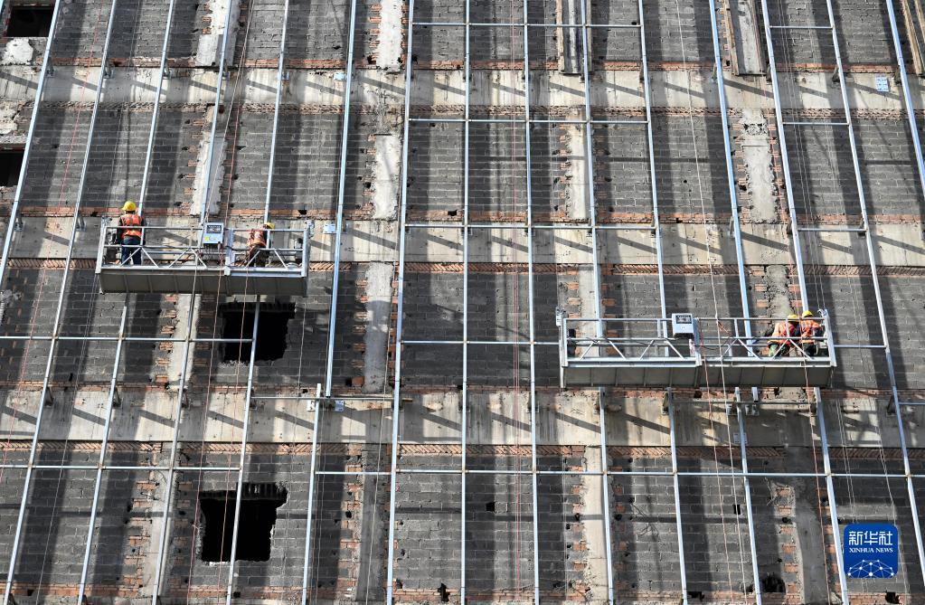 2月14日,工人在位于天津市和平區金街商圈的印象城項目現場(chǎng)施工。