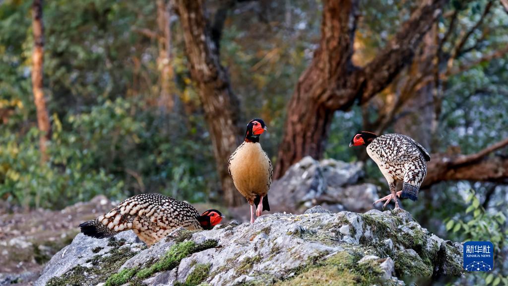 3月6日,在福建省建甌市小橋鎮梨山,三只黃腹角雉在巖石上覓食。