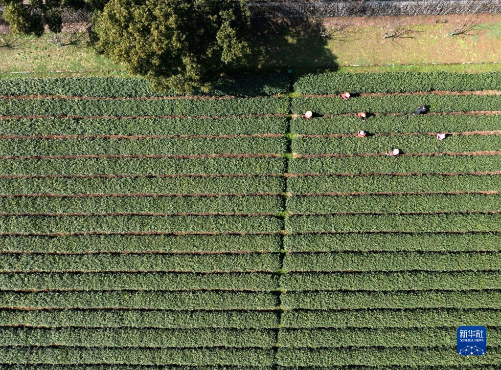 3月13日,梅家塢村的茶農在采摘西湖龍井“明前茶”(無(wú)人機照片)。