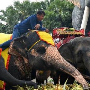 3月13日,在泰國芭堤雅東芭樂(lè )園,大象享用自助餐。