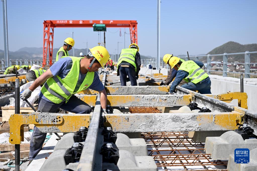 3月14日,在中鐵十一局池黃鐵路建設現場(chǎng),工人進(jìn)行無(wú)砟軌道施工作業(yè)。