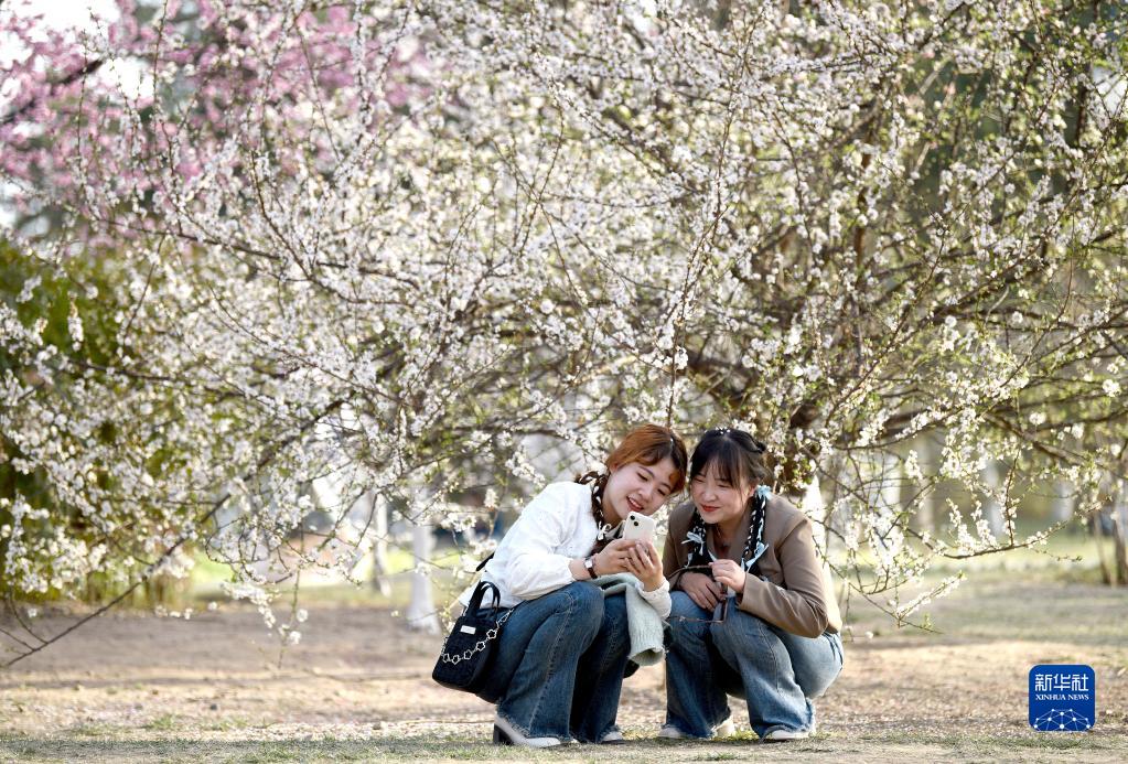 3月14日,游人在西安大明宮國家遺址公園內賞花休閑。