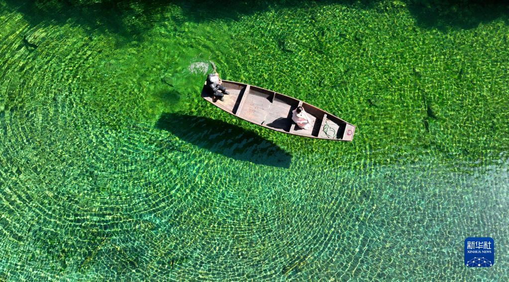湖北省恩施土家族苗族自治州鶴峰縣容美鎮屏山村屏山旅游景區河水清澈見(jiàn)底,舟行水上如懸浮空中,美如畫(huà)卷。
