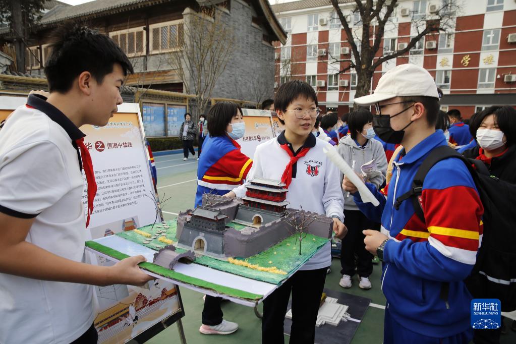 當日,北京市第五中學(xué)分校第六屆“國潮來(lái)襲——北京中軸線(xiàn)”主題科技嘉年華跨學(xué)科綜合實(shí)踐作品設計展示活動(dòng)在校園舉行。學(xué)校組織學(xué)生通過(guò)制作縮微景觀(guān)沙盤(pán)、文創(chuàng )作品設計、拍攝微電影等形式,結合語(yǔ)文、歷史、地理、藝術(shù)、信息等學(xué)科研討挖掘周邊資源,跨學(xué)科、多角度地詮釋“北京中軸線(xiàn)”的歷史文化和建設成就。