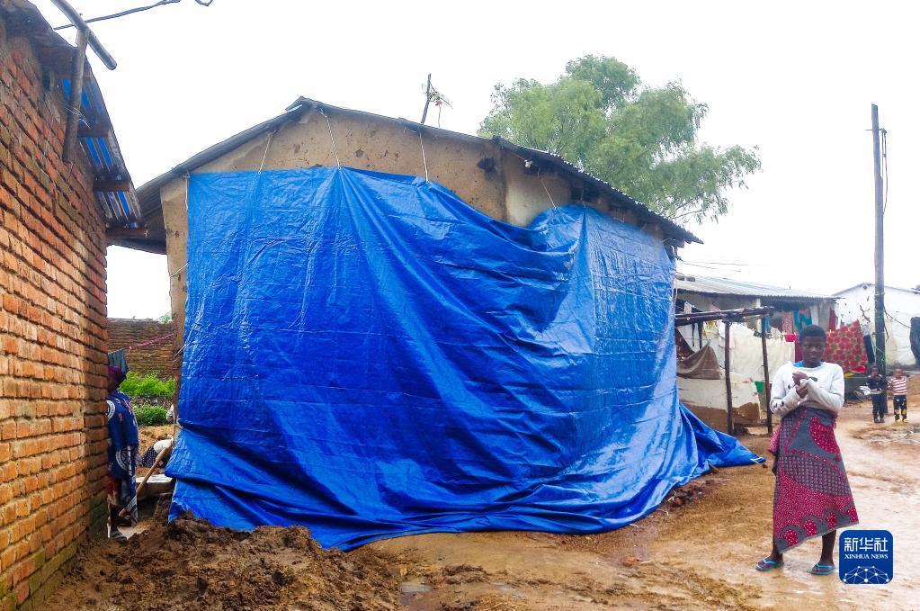 3月14日,在馬拉維南部的布蘭太爾地區,一名女子站在一棟用塑料布覆蓋的房子旁。