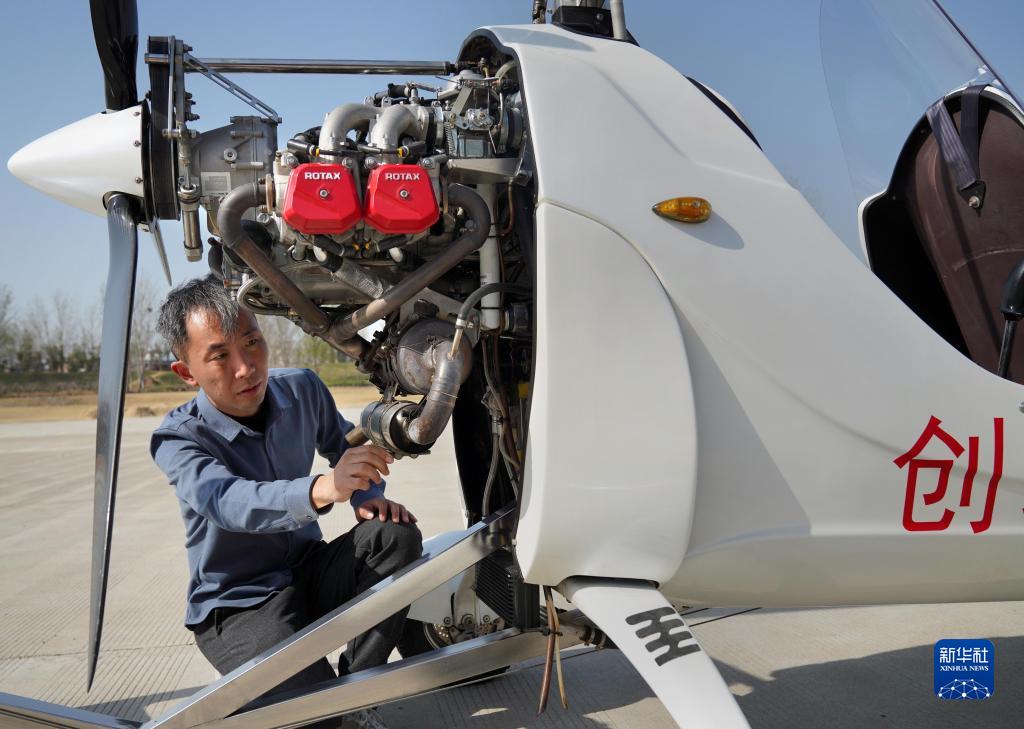 3月14日,在洛陽(yáng)市宜陽(yáng)縣的飛行營(yíng)地,楊世誼在進(jìn)行旋翼機飛行后檢查。
