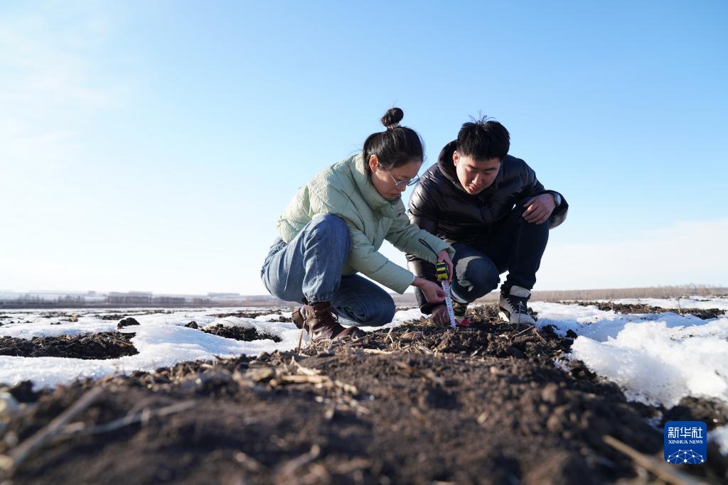 3月14日,在北大荒集團建設農場(chǎng)有限公司農業(yè)科技園區試驗田,孫凡紅(左)與同事測量融雪期土壤融化深度情況。