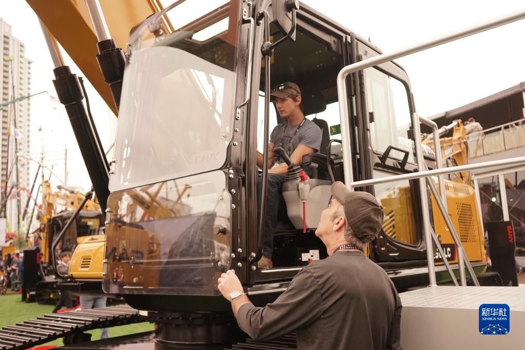 3月14日,一位參觀(guān)者在拉斯維加斯工程機械展上試駕中國企業(yè)三一重工的設備。