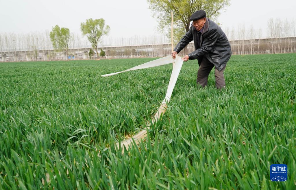 3月15日,在山東省菏澤市牡丹區,村民鋪設水管,為小麥澆“返青水”。