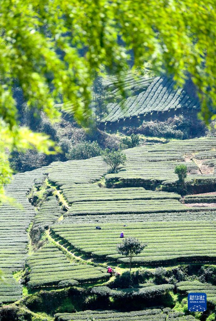 3月15日,湖北省恩施土家族苗族自治州宣恩縣椒園鎮的茶農在茶園里采摘春茶。