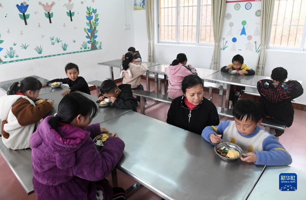 廣西金秀瑤族自治縣忠良鄉山界教學(xué)點(diǎn)的教師陶鳳英陪學(xué)生吃午飯(3月15日攝)。