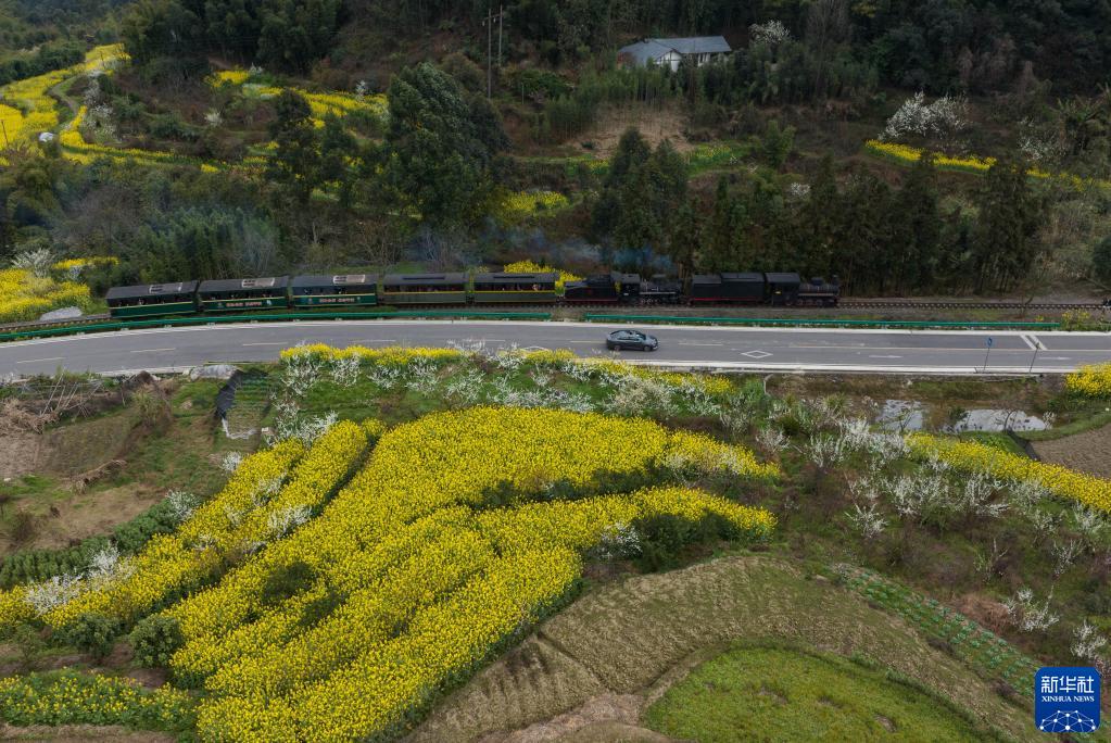 3月14日,“張火癡”駕車(chē)追趕蒸汽小火車(chē)(無(wú)人機拍攝)。