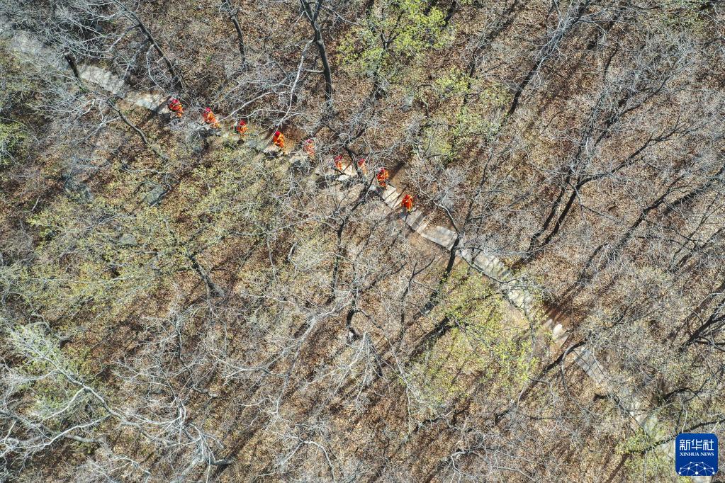 3月15日,長(cháng)清區國有蓮臺山林場(chǎng)防火中隊隊員在林區巡護(無(wú)人機照片)。