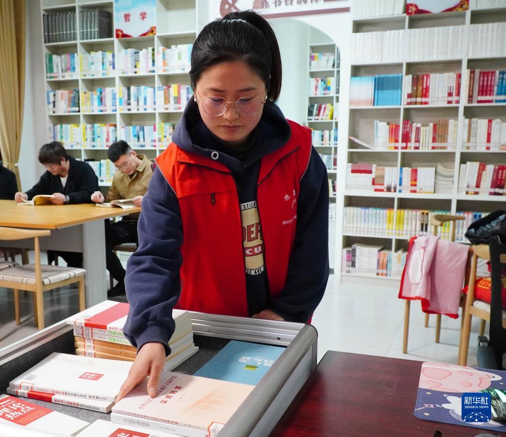 3月16日,在山東省菏澤魯西新區陳集鎮,“牡丹書(shū)房”里的志愿者在整理圖書(shū)。