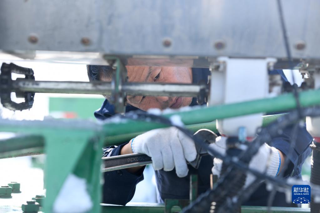 3月16日,在北大荒集團建設農場(chǎng)有限公司第四管理區,農機技術(shù)員在檢修農機具。