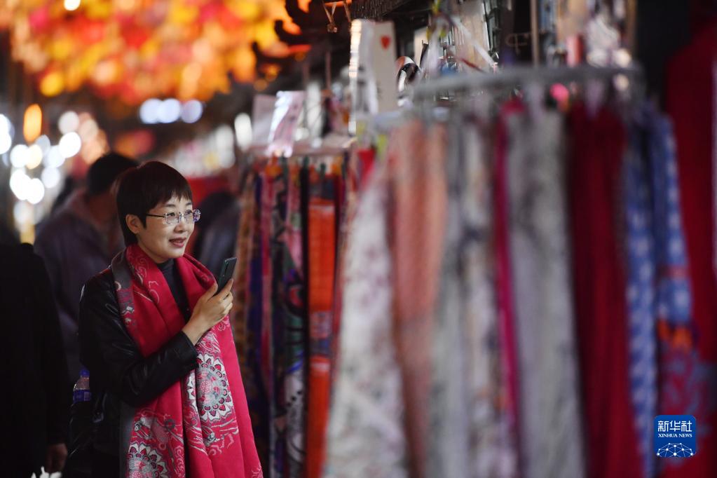 一名游客在敦煌夜市選購披肩(3月16日攝)。