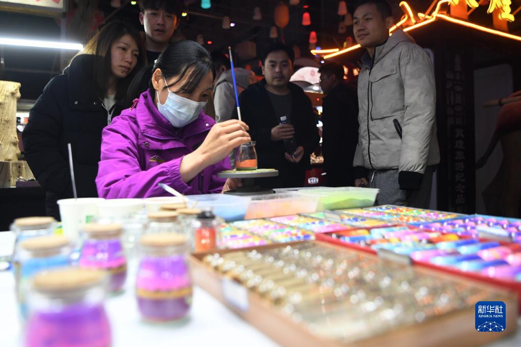 一名攤主在敦煌夜市制作沙畫(huà)瓶(3月16日攝)。