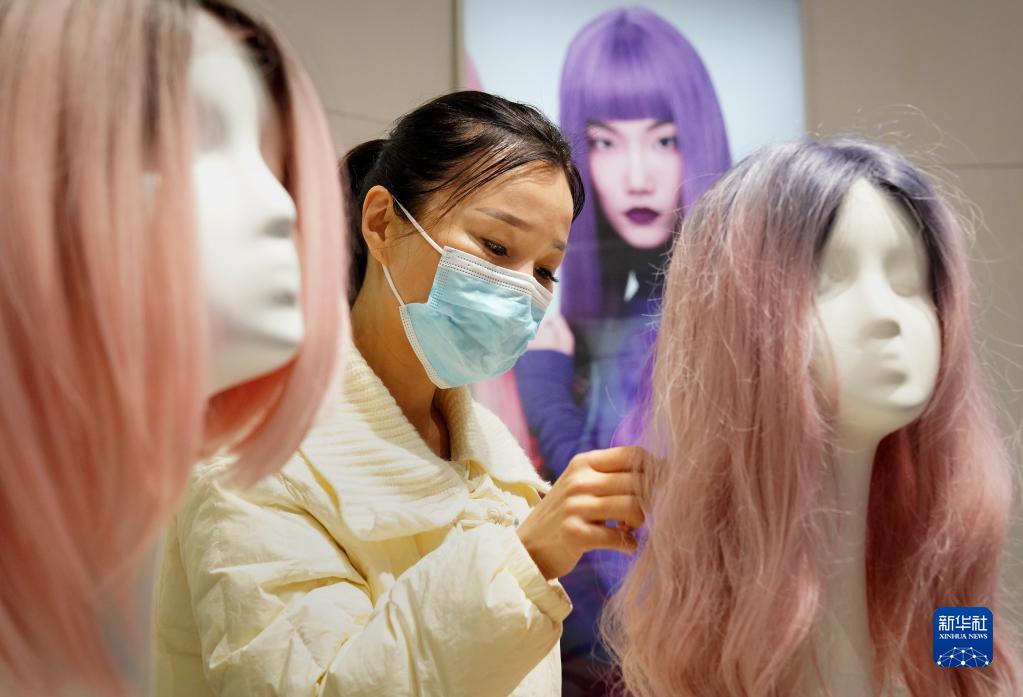 3月16日,市民在河南瑞貝卡發(fā)制品股份有限公司的展廳內挑選假發(fā)。