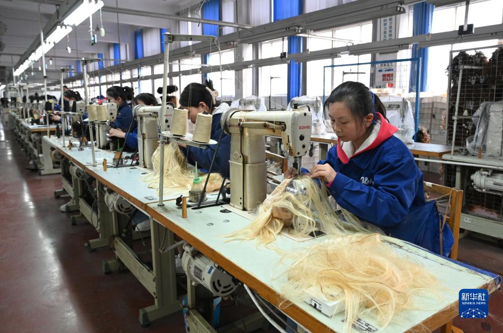 3月15日,工作人員在河南瑞貝卡發(fā)制品股份有限公司的生產(chǎn)車(chē)間里制作假發(fā)。