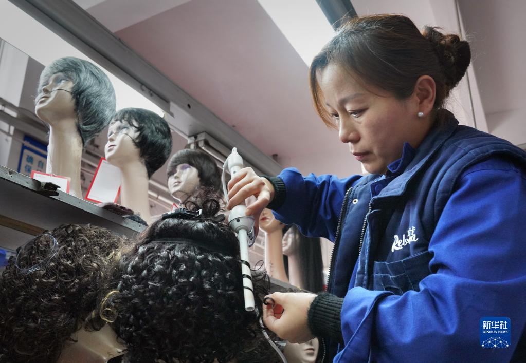 3月16日,工作人員在河南瑞貝卡發(fā)制品股份有限公司的生產(chǎn)車(chē)間里制作假發(fā)。
