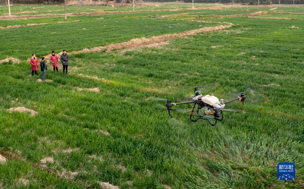3月16日,張必超(右一)在諸暨市浣東街道太和村操作植保無(wú)人機,為一戶(hù)村民的農田撒藥(無(wú)人機照片)。