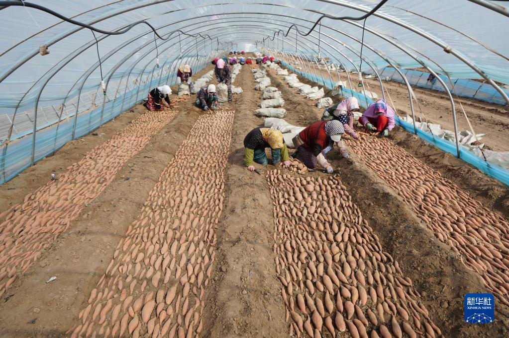 3月17日,灤南縣東黃坨鎮紅薯種植專(zhuān)業(yè)合作的社員在往育苗床上擺放紅薯種薯。