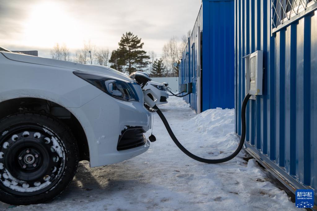 3月17日,在漠河紅河谷寒地試車(chē)基地,車(chē)輛在充電。