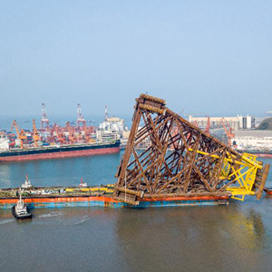 3月17日,在深圳赤灣海洋工程碼頭,“海洋石油228”運輸駁船搭載著(zhù)恩平20-4平臺導管架啟航(無(wú)人機照片)。