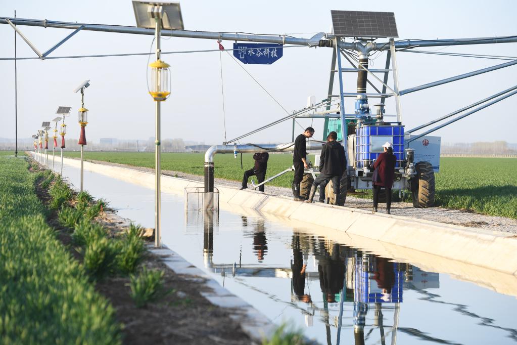 3月14日,在西平縣老王坡高標準農田示范區,劉亞輝(左二)和檢修人員一起檢查噴灌機。