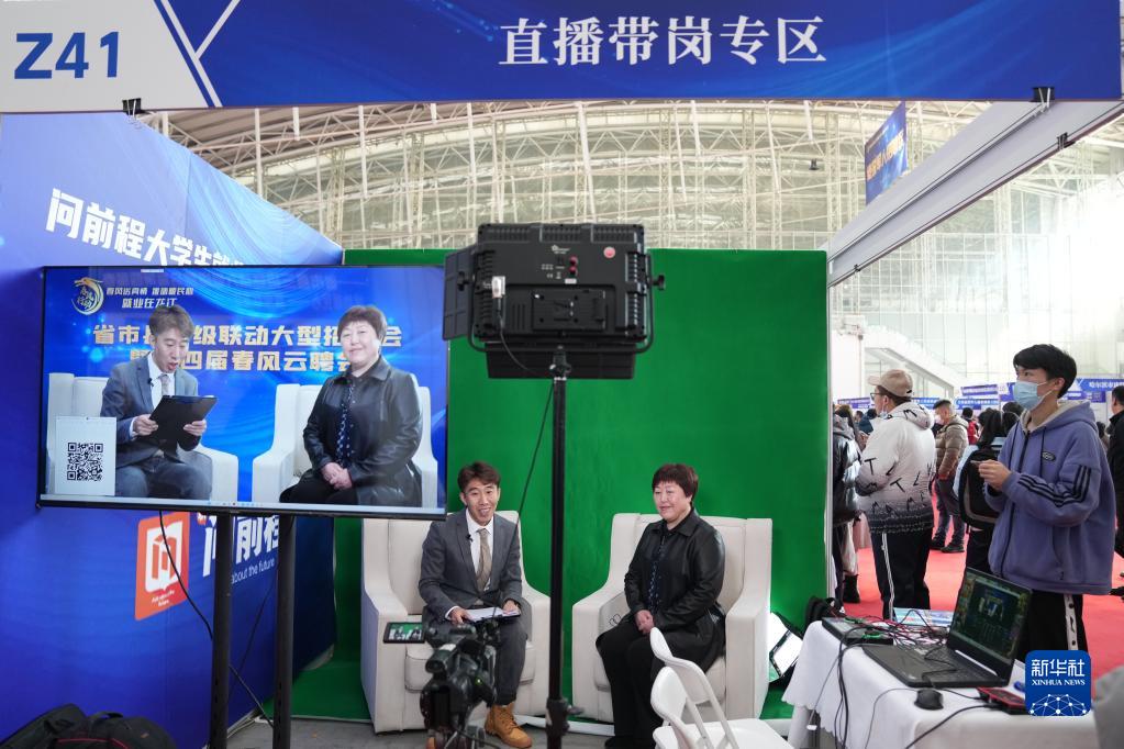 3月18日,在招聘會(huì )的直播帶崗專(zhuān)區,工作人員在進(jìn)行帶崗直播。