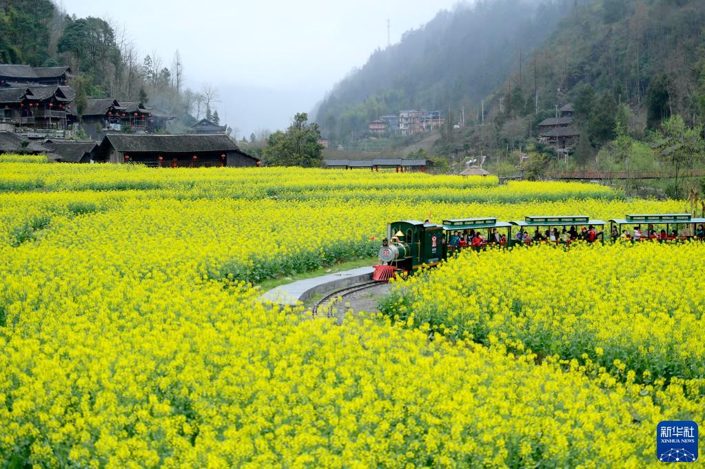 3月18日,在湖北省宣恩縣彭家寨古吊腳樓前,人們乘坐“小火車(chē)”在花海里游覽。