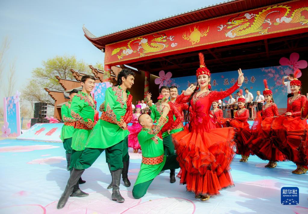 3月18日,演員在吐魯番杏花節開(kāi)幕式上表演。