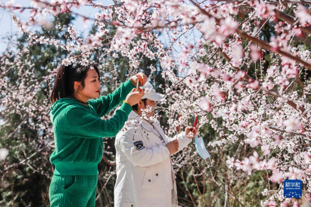 3月18日,游客在河北省遵化市黨峪鎮桃花山景區游玩拍照。