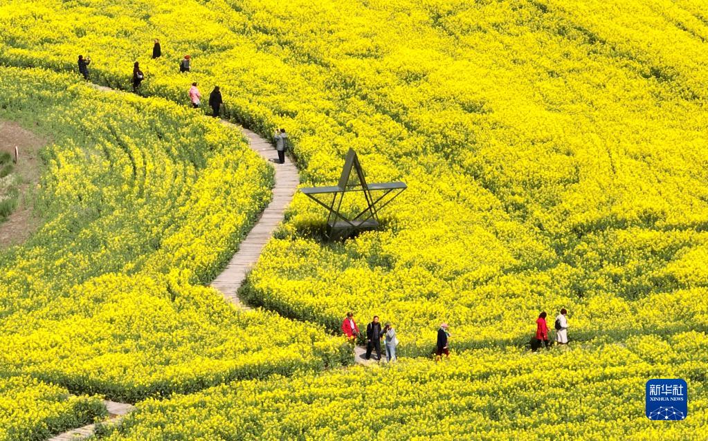 3月18日,游客在江蘇揚州高郵湖上花海景區踏青賞花(無(wú)人機照片)。