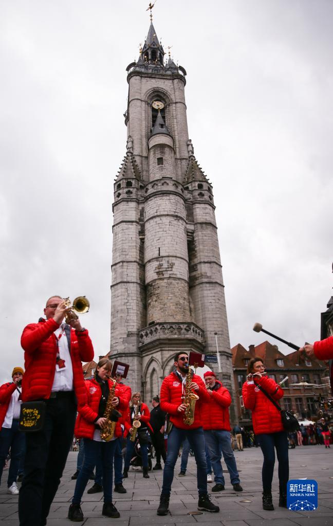 3月18日,在比利時(shí)圖爾奈狂歡節期間,樂(lè )隊在圖爾奈鐘樓前表演。