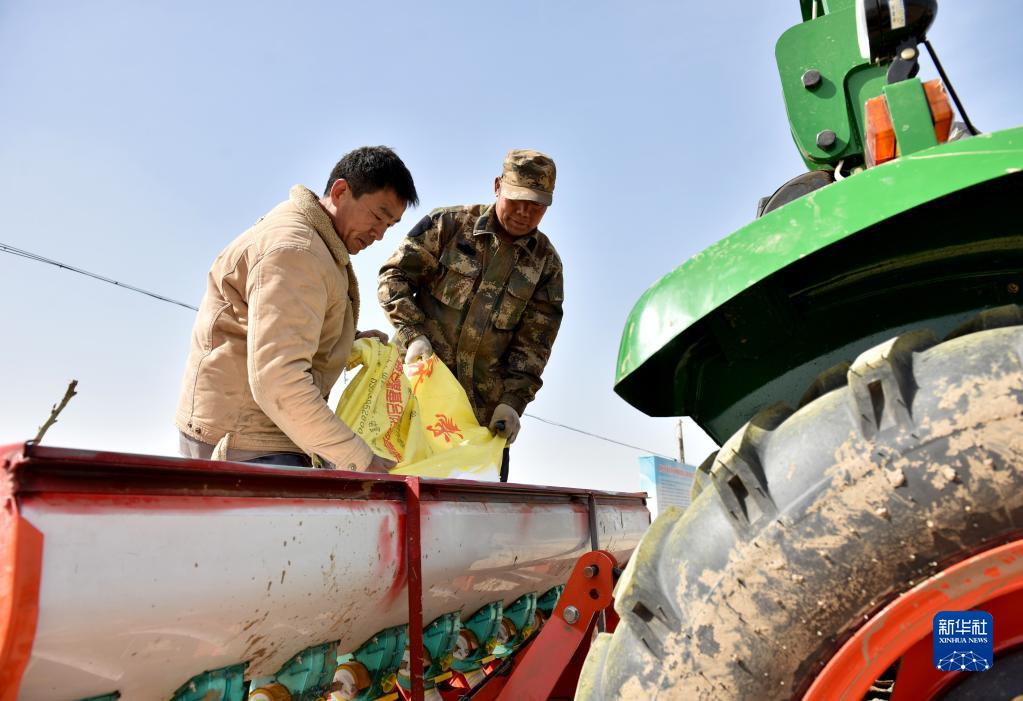 3月19日,河北省邢臺市南和區賈宋鎮寧營(yíng)村農民在麥田為農機添加肥料。