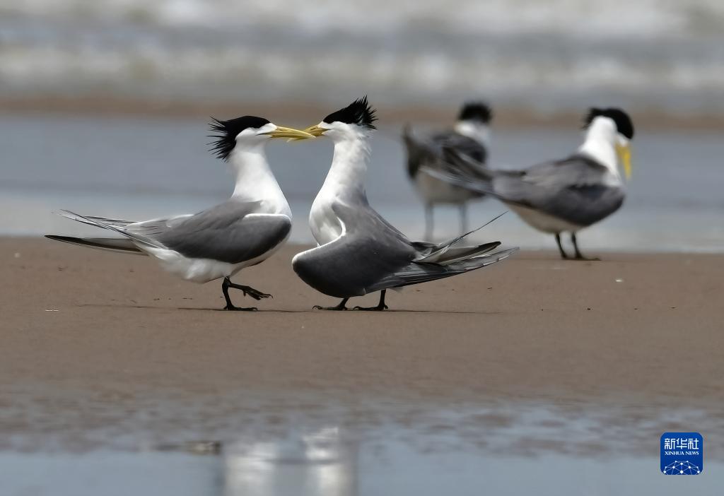 4月22日,國家二級保護野生動(dòng)物大鳳頭燕鷗在閩江河口濕地沙灘上嬉戲。