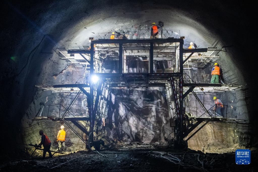 4月27日,在湖南桑龍高速賀龍隧道,工人做爆破施工前的準備工作。