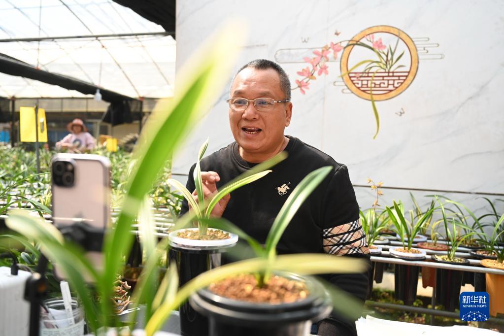 3月1日,在福建漳州,臺農許傳輝在“青心蘭園”里直播“帶貨”。