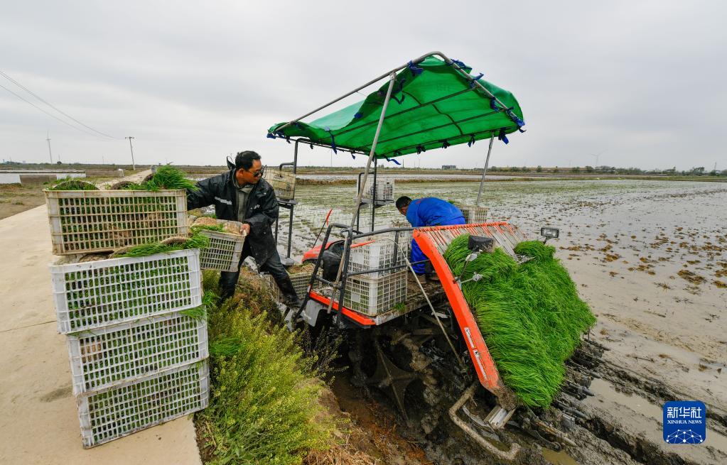 5月5日,在天津市優(yōu)質(zhì)農產(chǎn)品開(kāi)發(fā)示范中心,農民將秧苗搬運上插秧機。