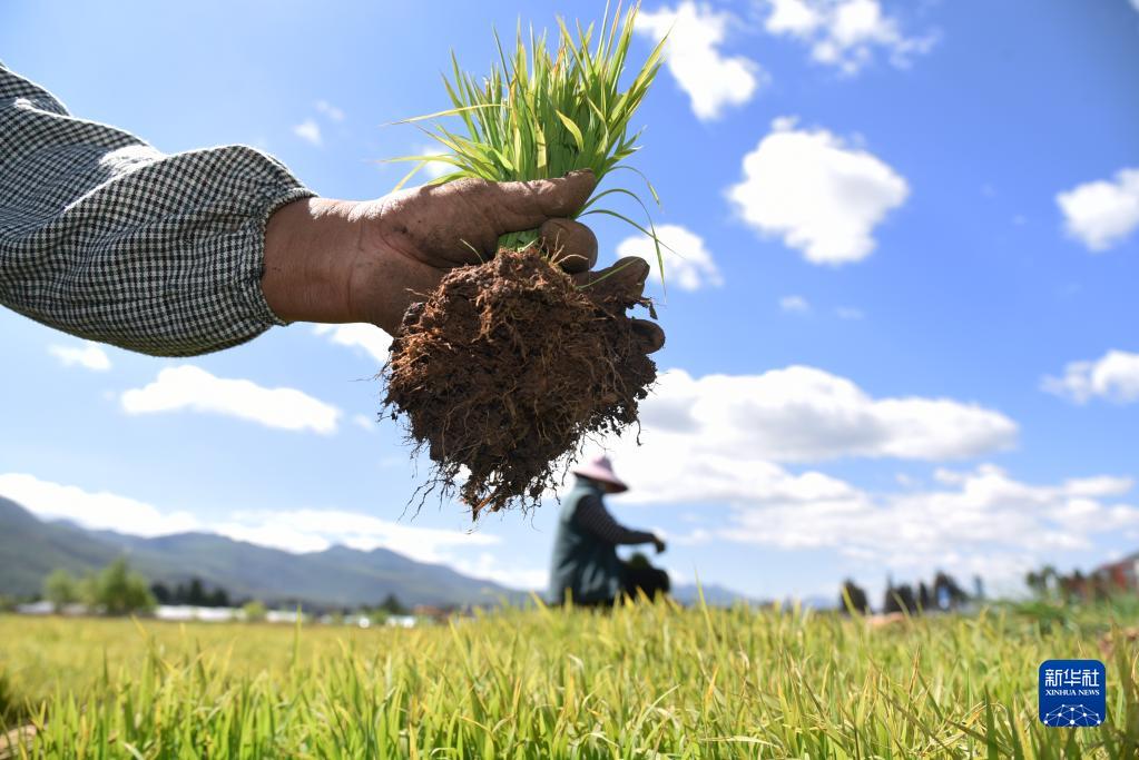 5月4日,在云南省麗江市古城區金山街道東元社區田間,村民在拔秧苗,準備移栽水稻秧苗。